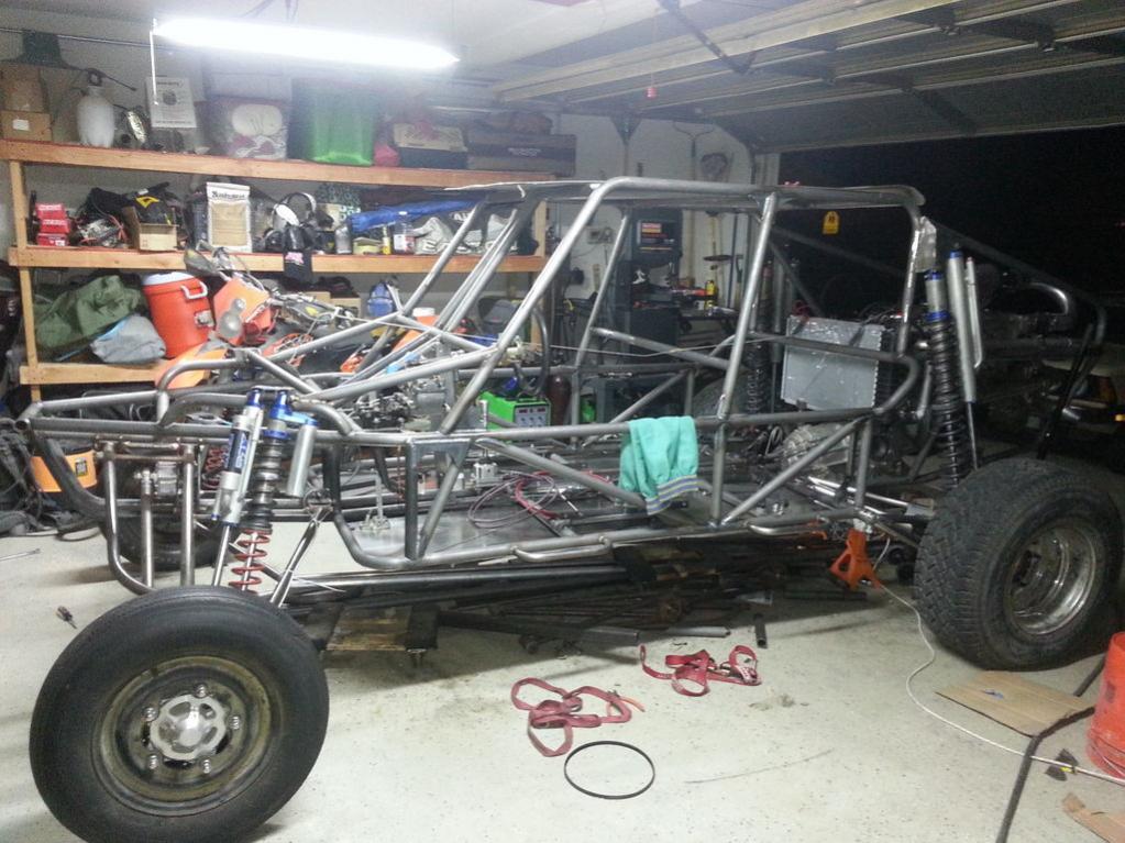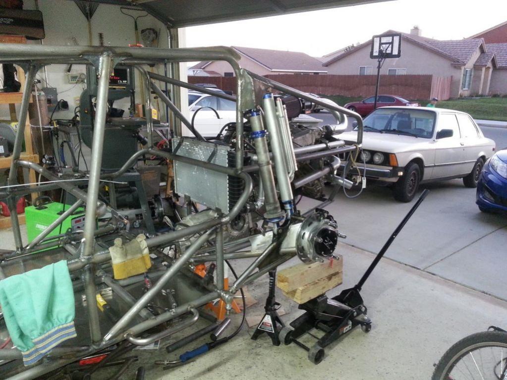 Finally got my buddy to cnc plasma out the parts I was begging for. Got the front bulk heads for all the suspension and all my gussets. Got all the gussets tacked in tonight and I'm planning on doing the front suspension tomorrow. I ordered standard width front seats, but I think they sent me the +2" width front seats, as they are REALLY tight. The radiator is out of a 5.0 mustang and appears to be a pretty nice single pass radiator with an oil cooler. Hopefully its enough to keep the 3.0 liter Nissan cool. If not, I'll have to find a larger double pass radiator. Got the "windshield" downtubes remade and tacked in. Motor and transmission are in for good with the clutch and starter mounted. All I need to finish that is the slave cylinder. Tacked the pedals in but had to rip them out to put in the gussets. Once I put the seats in I realized the roll cage was way too low so I had to raise it to get some head room. Because its at an angle , when I raised it, it didn't hit the same point on the mid-rail as I planned initially, so I made up some braces to help spread the load out. I know its not ideal, but without redoing the entire bottom half of the frame, this is the best I could come up with. All the gussets are 3/16" mild steel. Also, I need to stop wearing short sleeves while I weld.