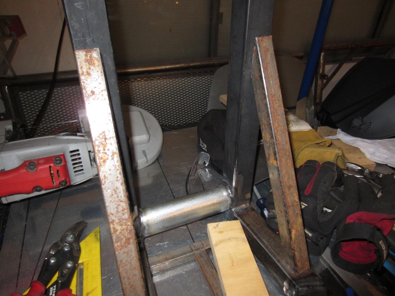 I still have to make latches and handles for the doors (once I mount them), and a few hooks for my leads and cables to hang from. Overall, the cart is around 4' long, 38" tall, and 15" wide. I plan to build an angle iron frame (later on) to set the cart and bottle holder into, so only 2 swivel casters and one pair of wheels on an axle are utilized. I'm actually surprised at how stable this cart is. The bottom shelf will be empty when everything is said and done, so that's an added bonus. I'm getting used to my new welder too.![]()