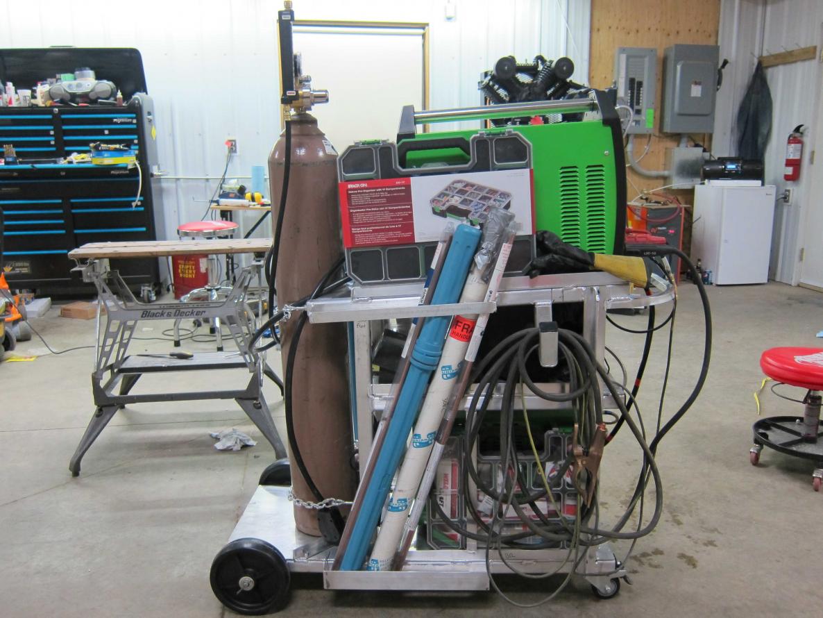 Bought my first house and it came with a 30'x60' shop so time to make a welding cart for my 250EX and not have to worry about making it too compact. During my Xmas vist to the parents in another province I managed to get some "scrap" aluminum from my father, mainly 3/16" sheet & 1" angle. He had a Pro-Tools bender and made me a handle.
