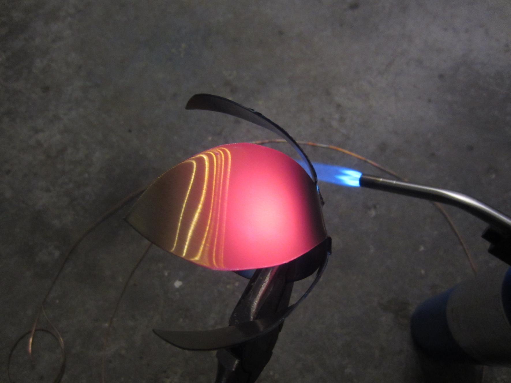 To "spice" things up, I usually use different heat treatments and combos of dissimilar metals throughout, though I didn't have access to an Oxy/Acetylene torch with it's smaller tip. A big tipped propane torch from the store was used (the coloring effects aren't nearly as good using a bigger torch tip!). This year's gift is (another) stainless vase with 1 copper rose, 1 stainless rose, and 1 rose consisting of copper and stainless both (which is the rose I welded to the stem).