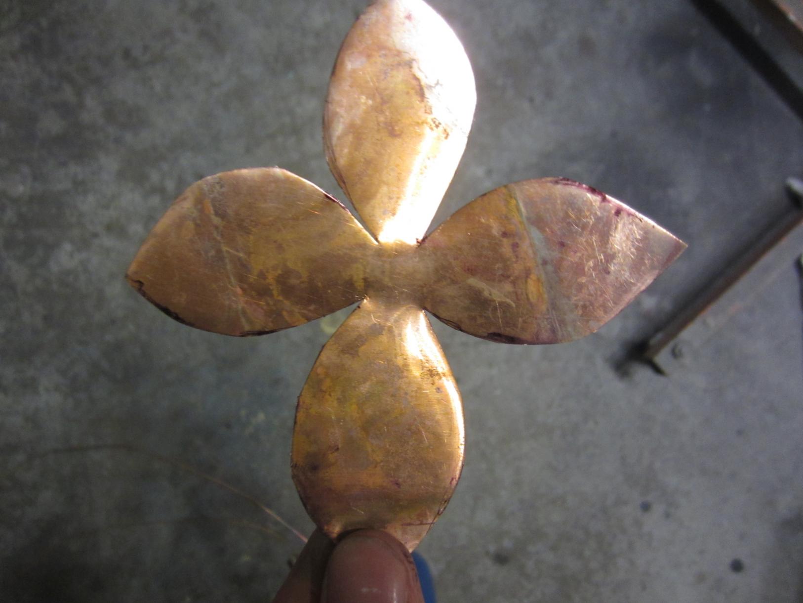 To "spice" things up, I usually use different heat treatments and combos of dissimilar metals throughout, though I didn't have access to an Oxy/Acetylene torch with it's smaller tip. A big tipped propane torch from the store was used (the coloring effects aren't nearly as good using a bigger torch tip!). This year's gift is (another) stainless vase with 1 copper rose, 1 stainless rose, and 1 rose consisting of copper and stainless both (which is the rose I welded to the stem).