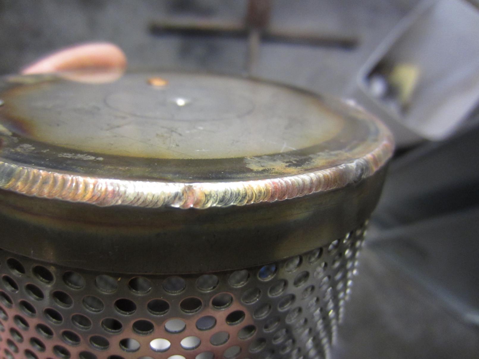 The vase is 20 gauge perforated 304 stainless which have hemmed over 24ga. stainless strips on the top and bottom edges (done before the material was rolled in the slip rolls). I rolled the flat material into a cylinder that is approx. 6" tall and 4" in diameter, and welded a stainless 20ga end cap on the bottom.