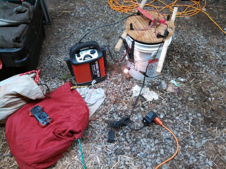 So then I dug around in my junk box and found a 12 volt, 1 amp transformer for some long-lost piece of hardware, so I cut off its plug and hooked its leads directly to the circuit. I also stuck a 12 volt light bulb in the circuit, to reduce the current a little bit and also to give me a visual indicator that the process was still occurring. The transformer was still running at about 1.5 amps, and it burned up after some hours of this, but who cares. It got the job done.