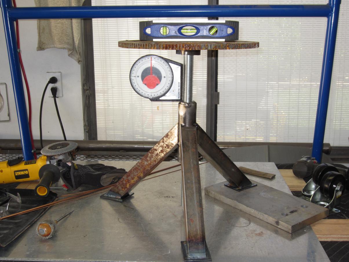 Everything was tig welded and my only regrets were using the 1.5" tubing for the legs since I had just enough to get by with (which made the legs a little too short for total stability), plus I chose not to increase the miter angle to (say for example) 60 degrees to gain the stability back. It's not a teeter totter mind you, but it would be nice if it had a wider foot print. When I cut the legs, I had one piece of tubing 25" long, and one piece 13" long, so I measured the long piece, marked a 45 degree angle on it in the center, cut it, then realized I used the 1" mark on the tape as my "0". I was a little pissed at myself for making such a silly mistake, but I had 3/4" plate laying around that worked well for a shim, and the remaining 1/4" was removed from the other 2 legs when I notched them for the round main body. The legs didn't look right mocked up to the main body at different heights, hence the shim at the bottom. It is adjustable from 18" to around 25" without the foam and a cover installed.