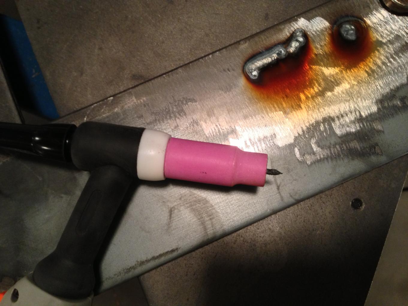 Sorry for the newbie questions again but what do you think is causing this brown discoloration/dust? I have the 210 set up on DCEN and have tried low-high Ar (100%) gas flow. I have 3 sec of pre flow and 5 sec of post flow. The discoloration seems to track the angle of the TIG torch. i.e. the contamination is mostly in the direction of the gas flow. I was using a 3/32" 1.5% lanthanated electrode. Amps were set at 50. I did grind the metal but didn't wash it down with acetone. I'll get some acetone tomorrow.