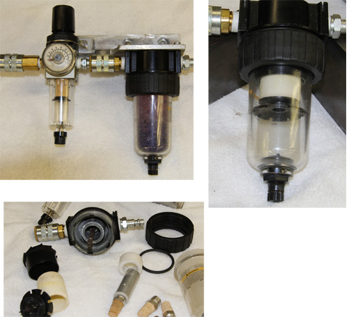 At the bottom of the aluminum tube is another acetal sleeve with a 40 micron filter screwed into it. That sleeve is held in place with a small screw. I tried a slip fit like the top, but filter sleeve kept falling out. I also inserted a screen at the intake end to keep the desiccant from spilling back out with the unit was tipped. (It also spit those blue bb’s at me when I disconnected the air, so the screen had to be added)
