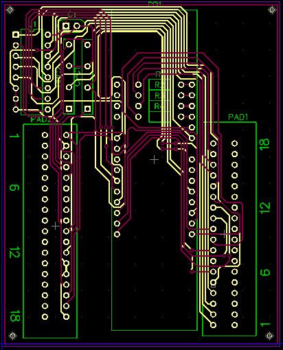 Also, I realized that, as long as I'm using the Boarduino on headers (vs. incorporating it into the PCB), the least I could do is use some of the space underneath it, so I stuck the resistors for the LEDs under there. I think that some of the remaining components, like the optoisolators, will also be low-profile enough to stick under the Boarduino if I need to.