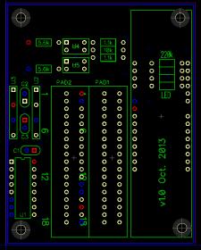 Also, I realized that, as long as I'm using the Boarduino on headers (vs. incorporating it into the PCB), the least I could do is use some of the space underneath it, so I stuck the resistors for the LEDs under there. I think that some of the remaining components, like the optoisolators, will also be low-profile enough to stick under the Boarduino if I need to.