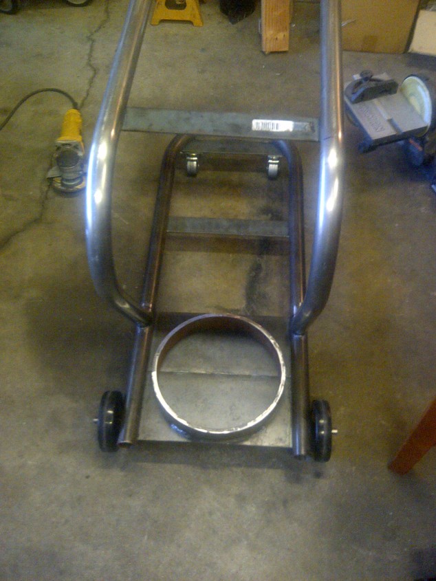 I made an axle from some 5/8" bar with the ends turned down to 1/2" and put some small casters on the front. Added a short ring of 10" pipe on the lower plate to hold the bottle captive.