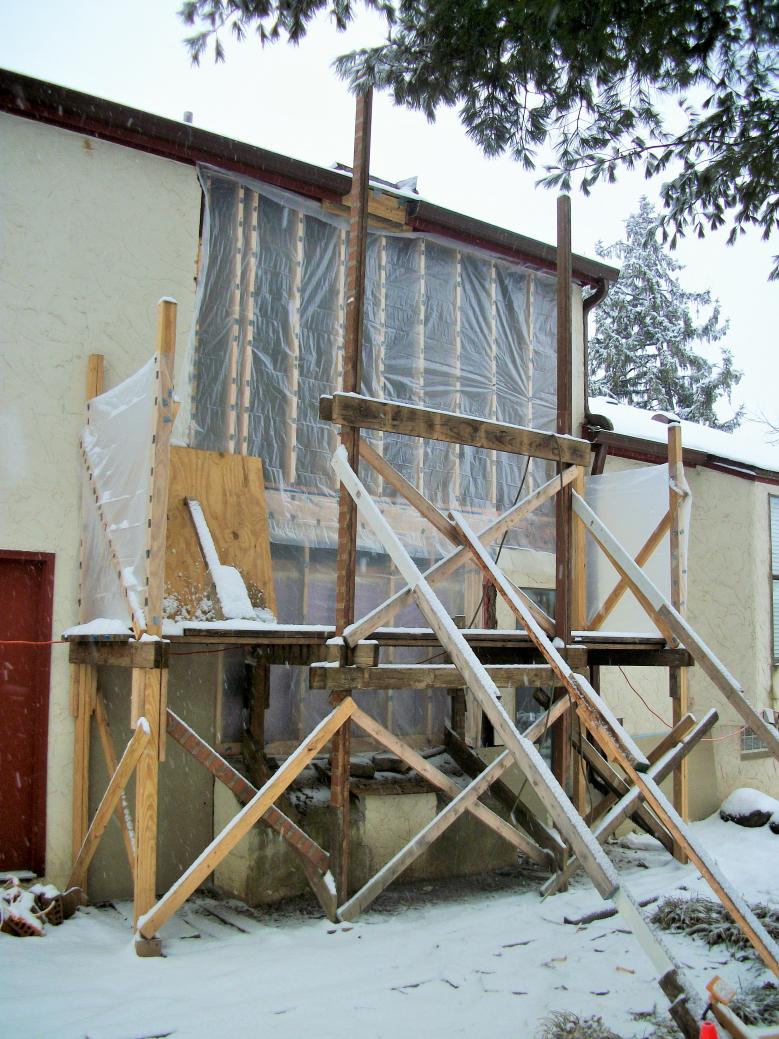 Gettin' closer to putting the screw jacks into service. The platform on top of the scaffolding will be fabricated out of salvaged decking joists.