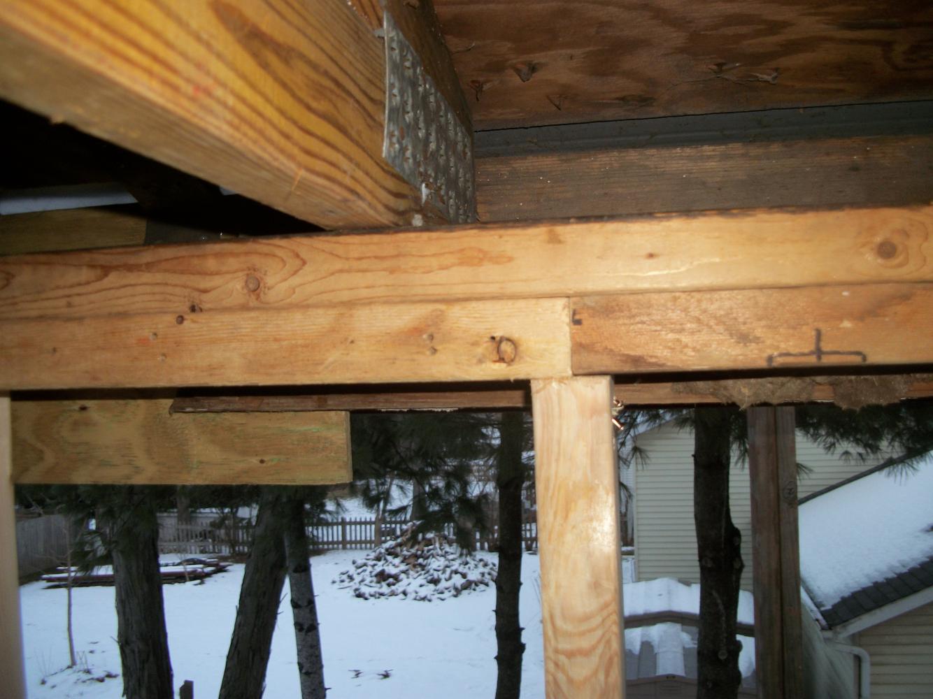 First photo shows the temporary support posts from the first floor great room missing. The second photo shows the right-most remaining floor joist scabbed and anchored into place with hanger.