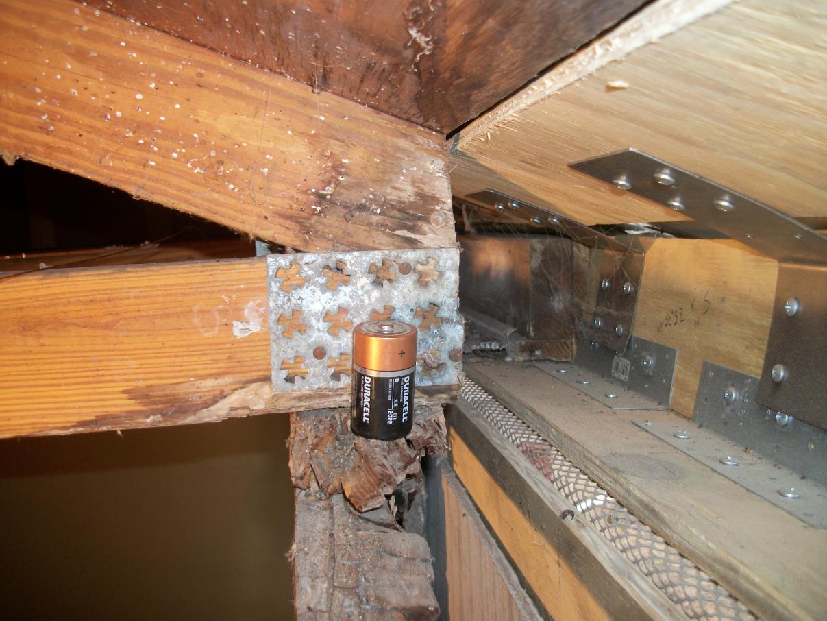 Photo #2. Water damaged truss plus the original builder modification for chimney installation -- a no-no. "D" cell battery for scale.
