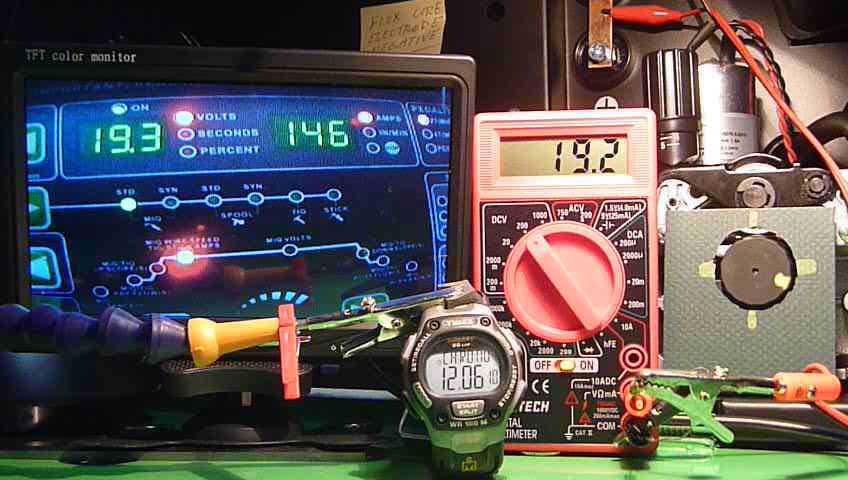 On the right side of the photo is the drive roller with yellow mark to monitor its rotation. I made a video while welding so it could record the drive roller rotation and the stop watch simultaneously. I viewed it in frame by frame mode so I could measure the time for each rotation of the shaft. The volt meter is measuring the gun voltage - I put a simple RC circuit on the meter to take care of the noise and any minor variations.