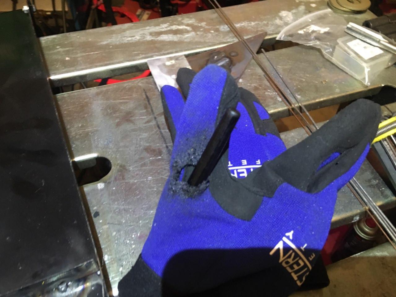 Touched glove to AL and melted a hole in it