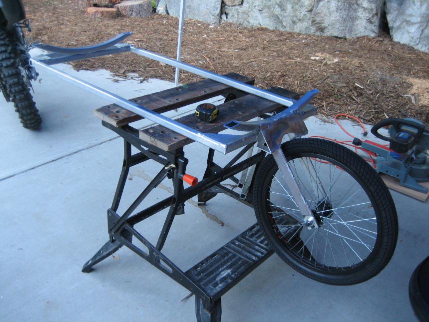 Pictures attached show the start of a trailer I want to pull behind my dirt bike. It will be fashioned after the "BOB" trailers that are popular for pedal bikes. I want this trailer to be able to pull my kayak down to the lake not to far from my home and also have it so I can shorten its length and use it out on the trail for trail maintenance and transporting things mostly off road. I live in a rural setting so not worried about the licensing and all of that.