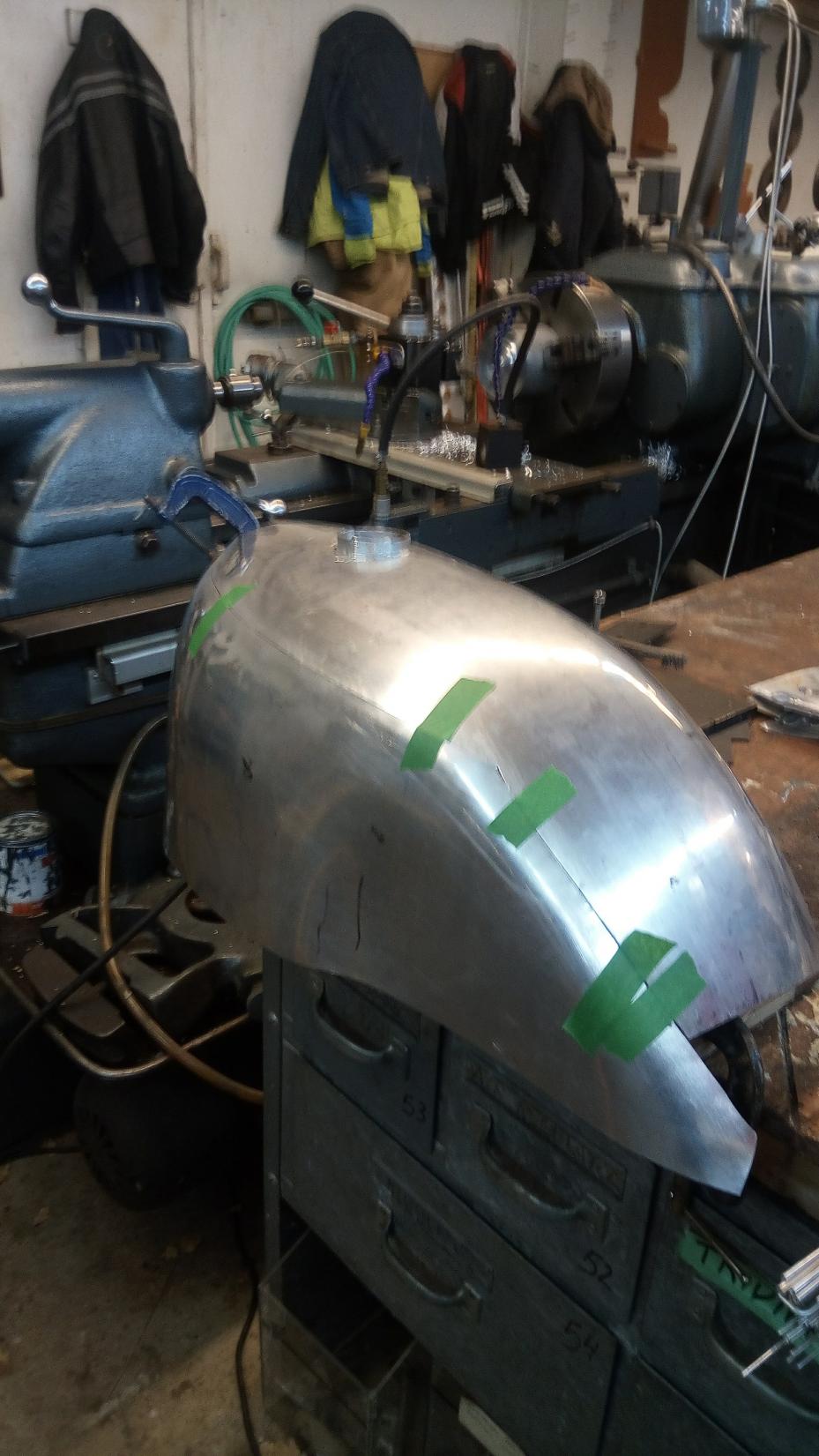 I recently built this tank for a Norton project bike. The plan is to use a Triumph Thruxton fairing at front, so the fuel tank top skin had to match a Thruxton R shape. The bottom has to be made to fit the Norton Commando.