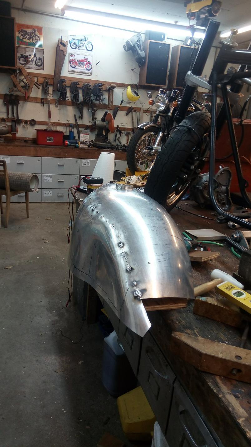 I recently built this tank for a Norton project bike. The plan is to use a Triumph Thruxton fairing at front, so the fuel tank top skin had to match a Thruxton R shape. The bottom has to be made to fit the Norton Commando.