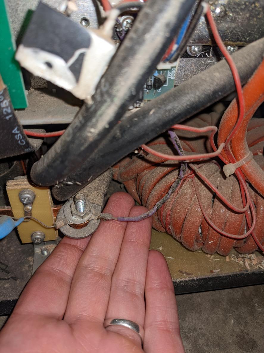 Should also mention that I initially miswired a NEMA 14-50 plug onto the machine (yes, I know, Everlast has restored my faith in manuals) and had neutral connected to one phase. Looking at this purple wire I'm fairly certain it smoked a long time before I touched the machine, but perhaps I've got two unrelated issues here.